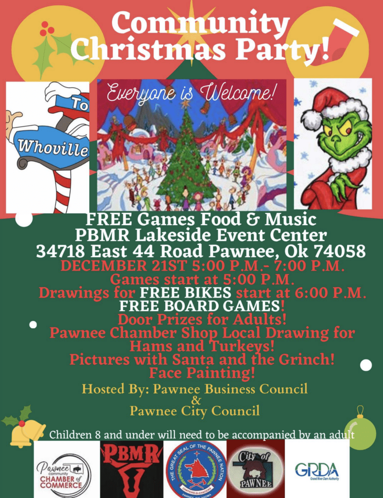 Below, find information for the Community Christmas Party hosted by the Pawnee Business Council and Pawnee City Council. This event will be held on Thursday December 21, 2023 5-7 PM at the PBMR Lakeside Event Center.