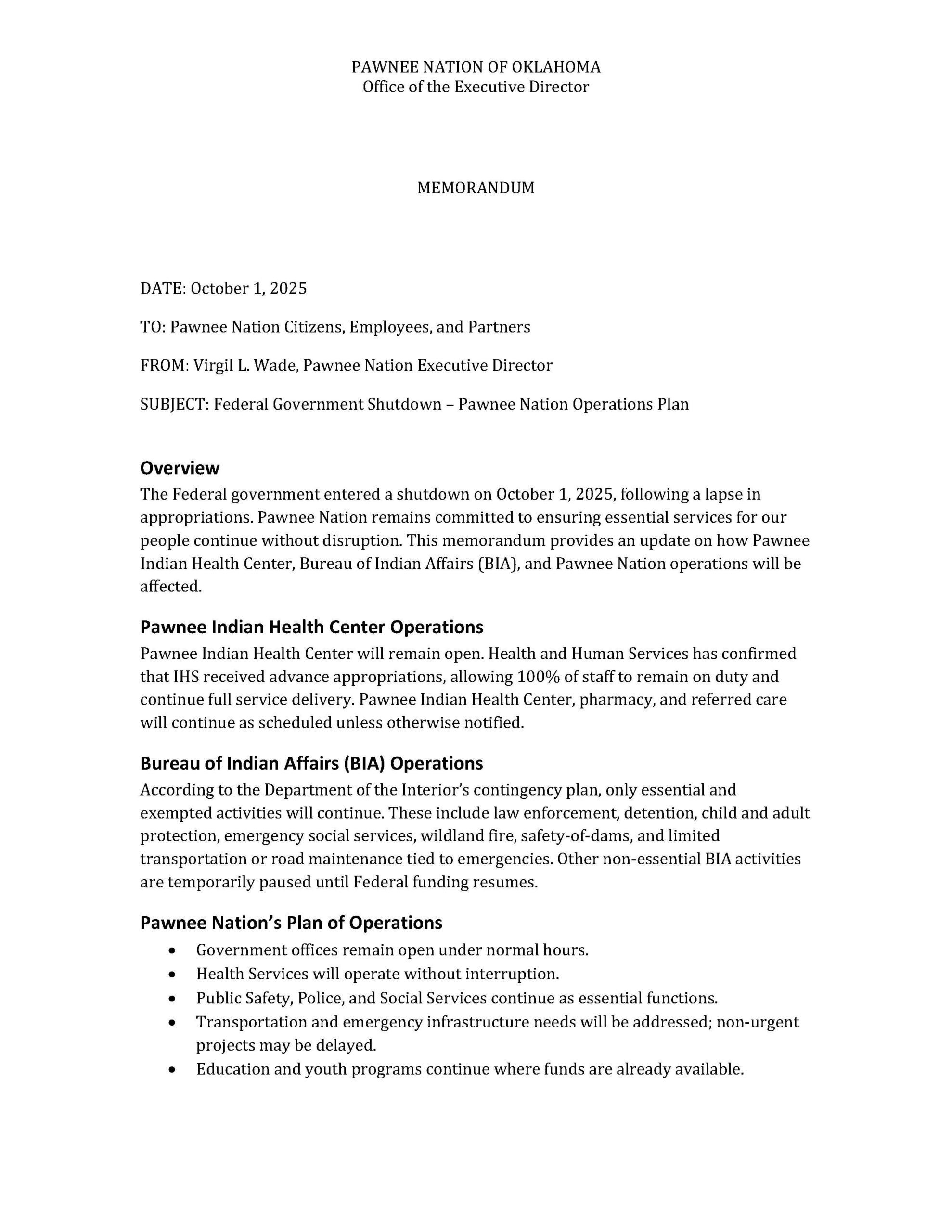 The Federal government entered a shutdown on October 1, 2025, following a lapse in appropriations. Pawnee Nation remains committed to ensuring essential services for our people continue without disruption. This memorandum provides an update on how Pawnee Indian Health Center, Bureau of Indian Affairs (BIA), and Pawnee Nation operations will be affected.