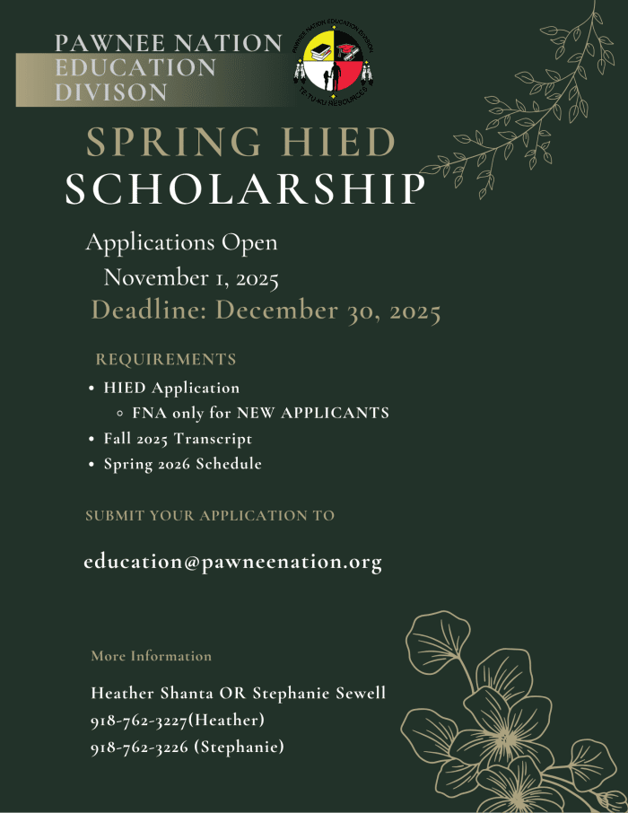 - Be a member of the Pawnee Nation of Oklahoma. Students must provide a proof of tribal membership.