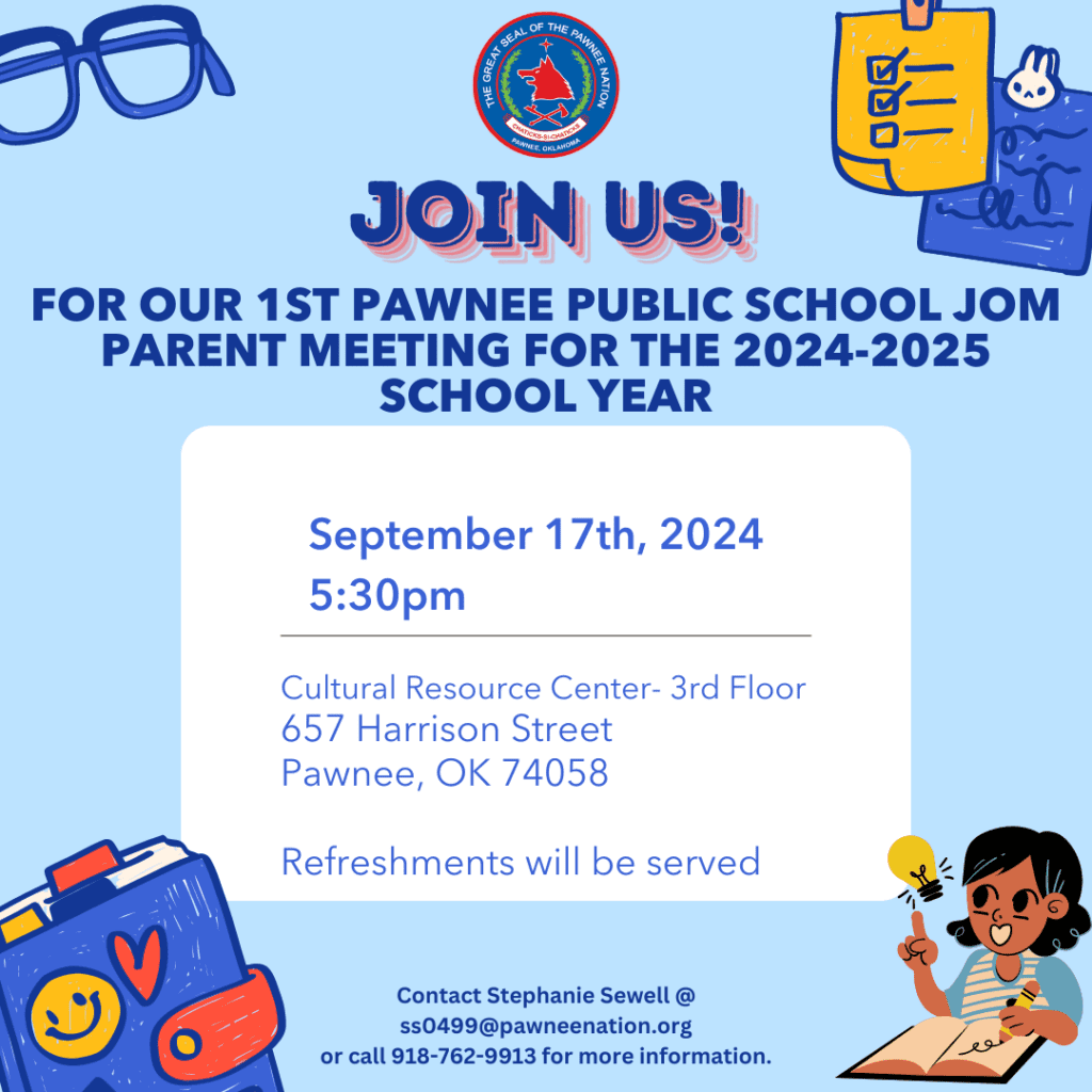 JOIN US for our 1st Pawnee Public School J.O.M. Parent Meeting for the 2024-2025 School Year