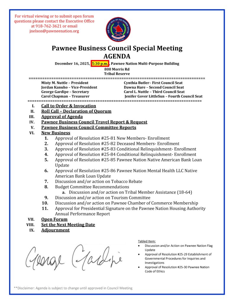 Pawnee Business Council Special Meeting Agenda for December 16, 2025 @ 5:30 PM