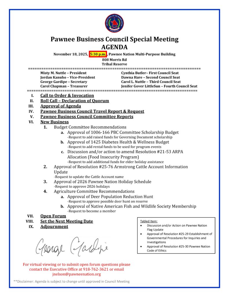 Pawnee Business Council Special Meeting Agenda for November 18, 2025