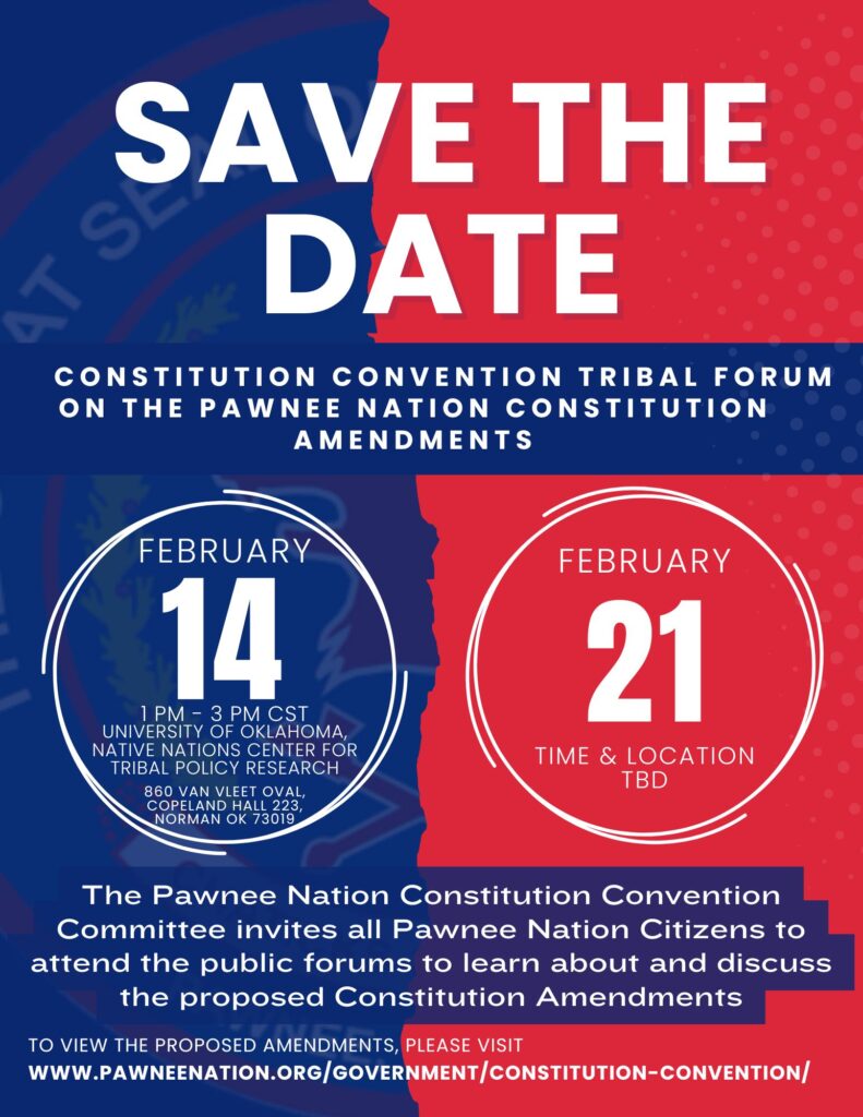 The Pawnee Nation Constitution Convention Delegates are hosting three (3) public forums to discuss proposed amendments to our Nation’s Constitution.