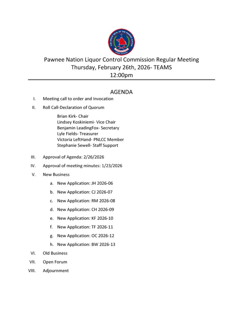 Pawnee Nation Liquor Control Commission Regular Meeting for Thursday, February 26, 2026 via TEAMS @ 12:00 p.m.