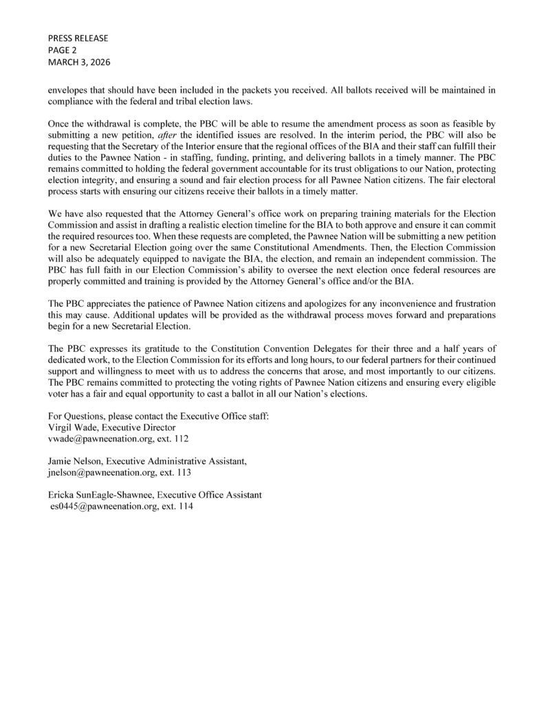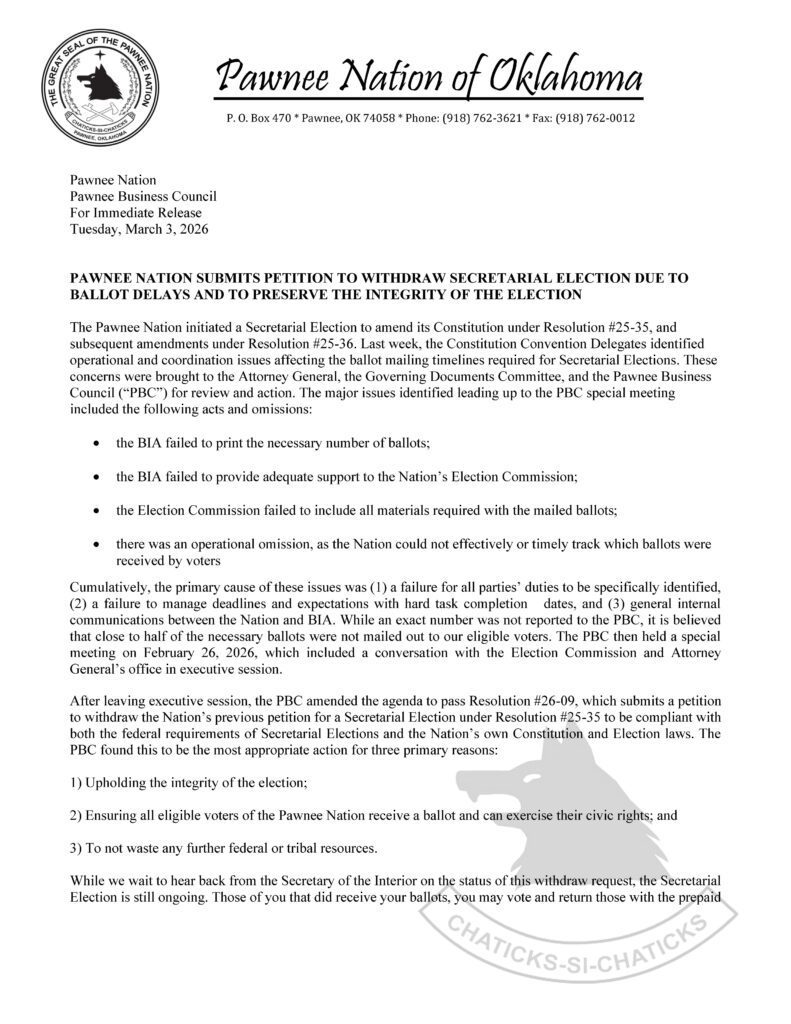 Pawnee Nation Submits Petition to Withdraw Secretarial Election Due to Ballot Delays and to Preserve the Integrity of the Election