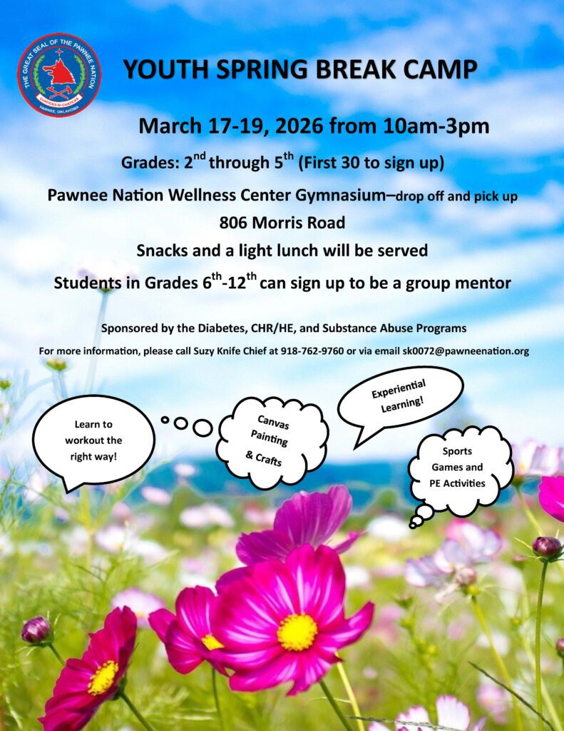 The Pawnee Nation Diabetes, CHR/HE, and Substance Abuse Programs PRESENT: YOUTH SPRING BREAK CAMP!!! 🌸🪷🌷🌼🌺
