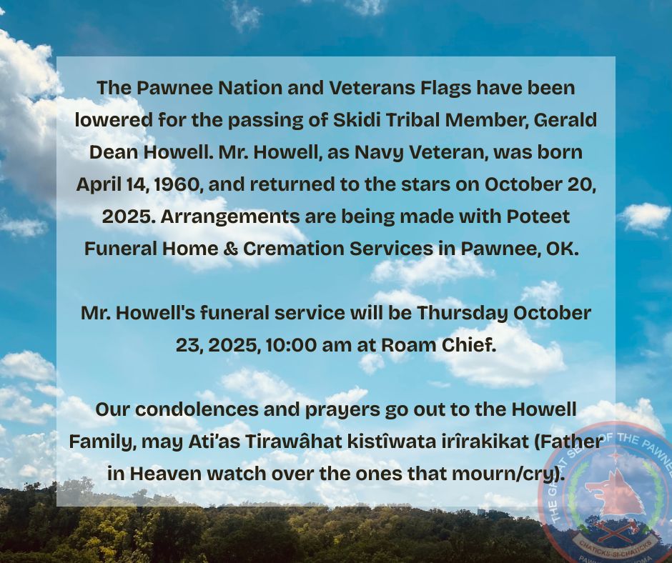 Tribal Member Passing– Skidi tribal member Gerald Dean Howell